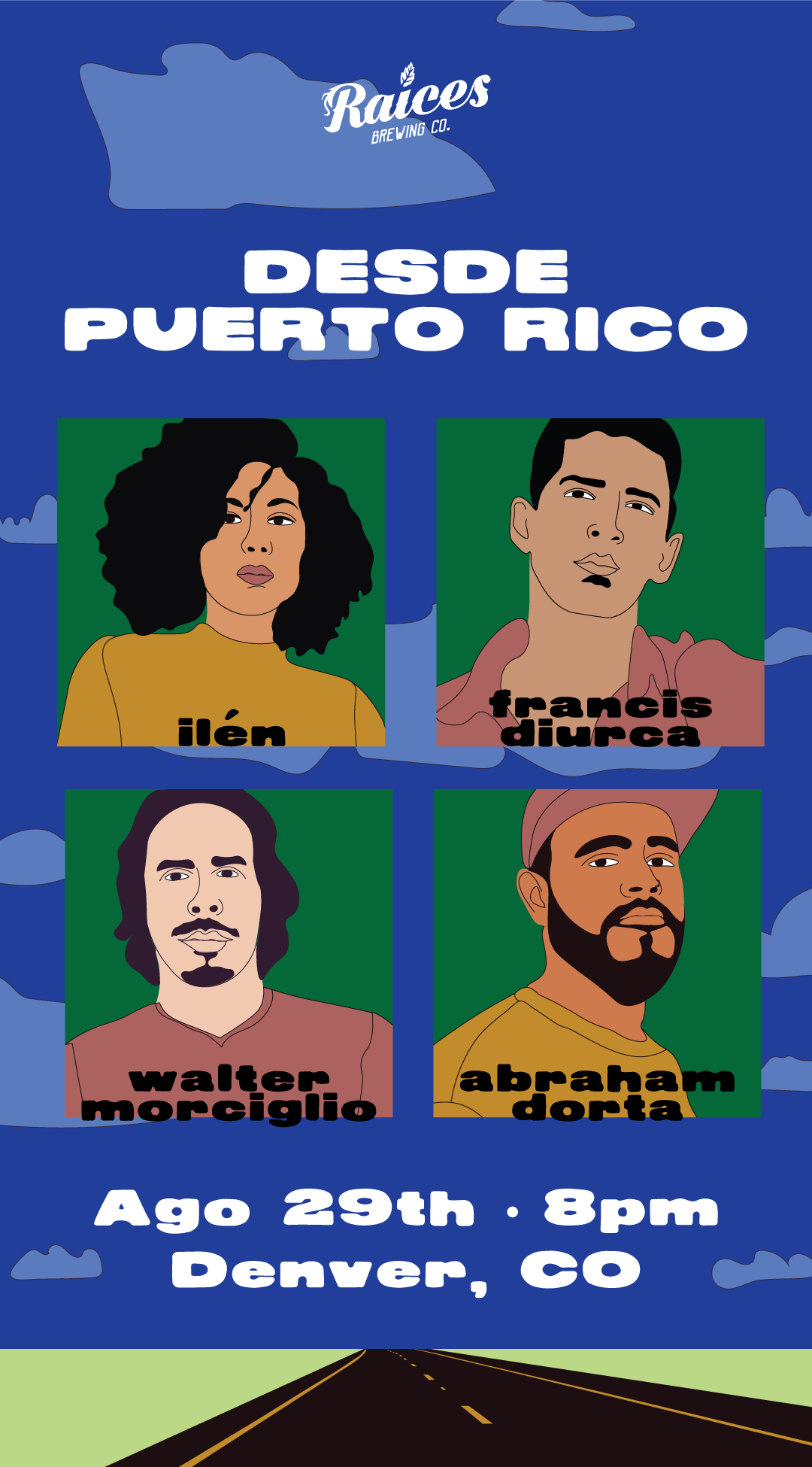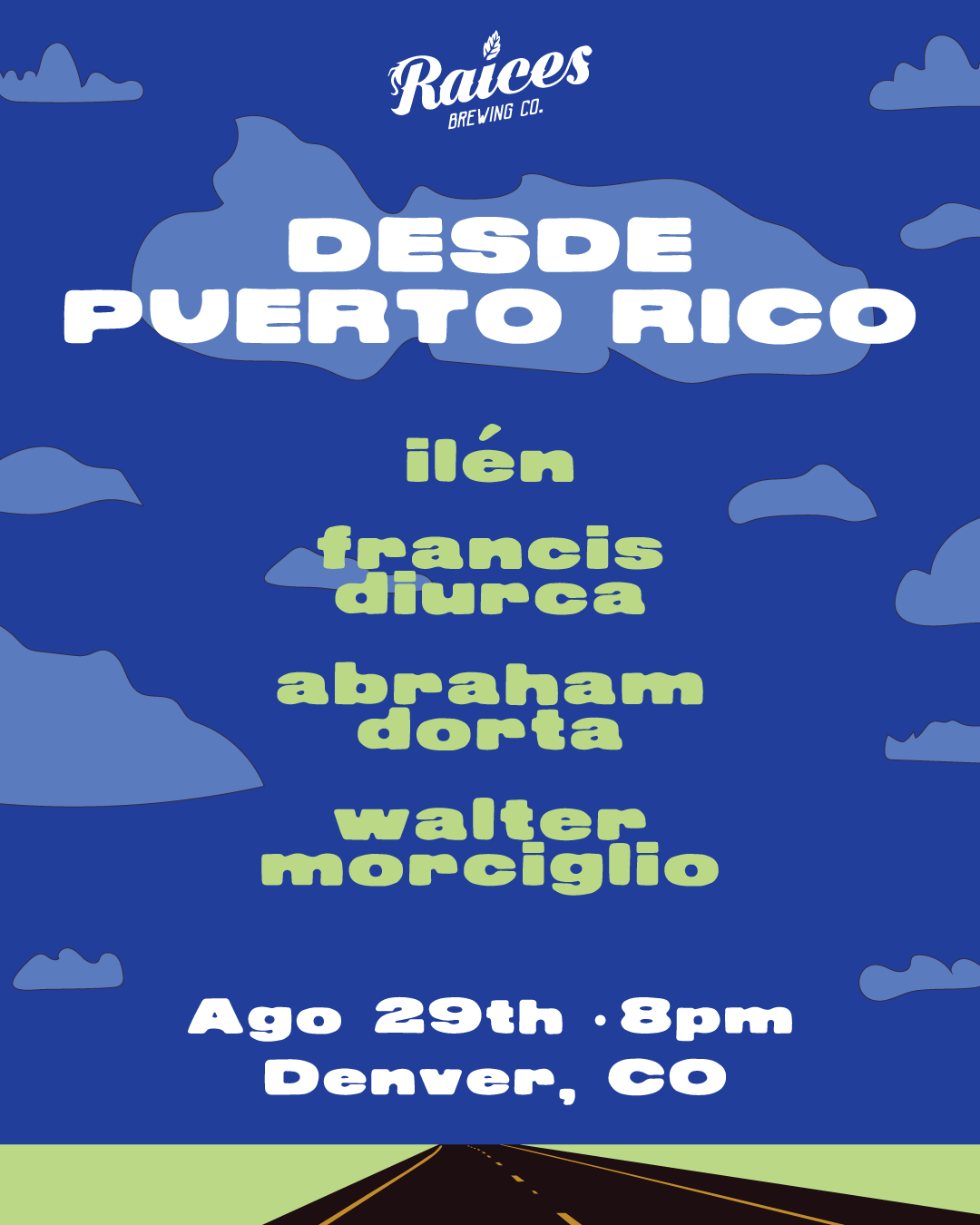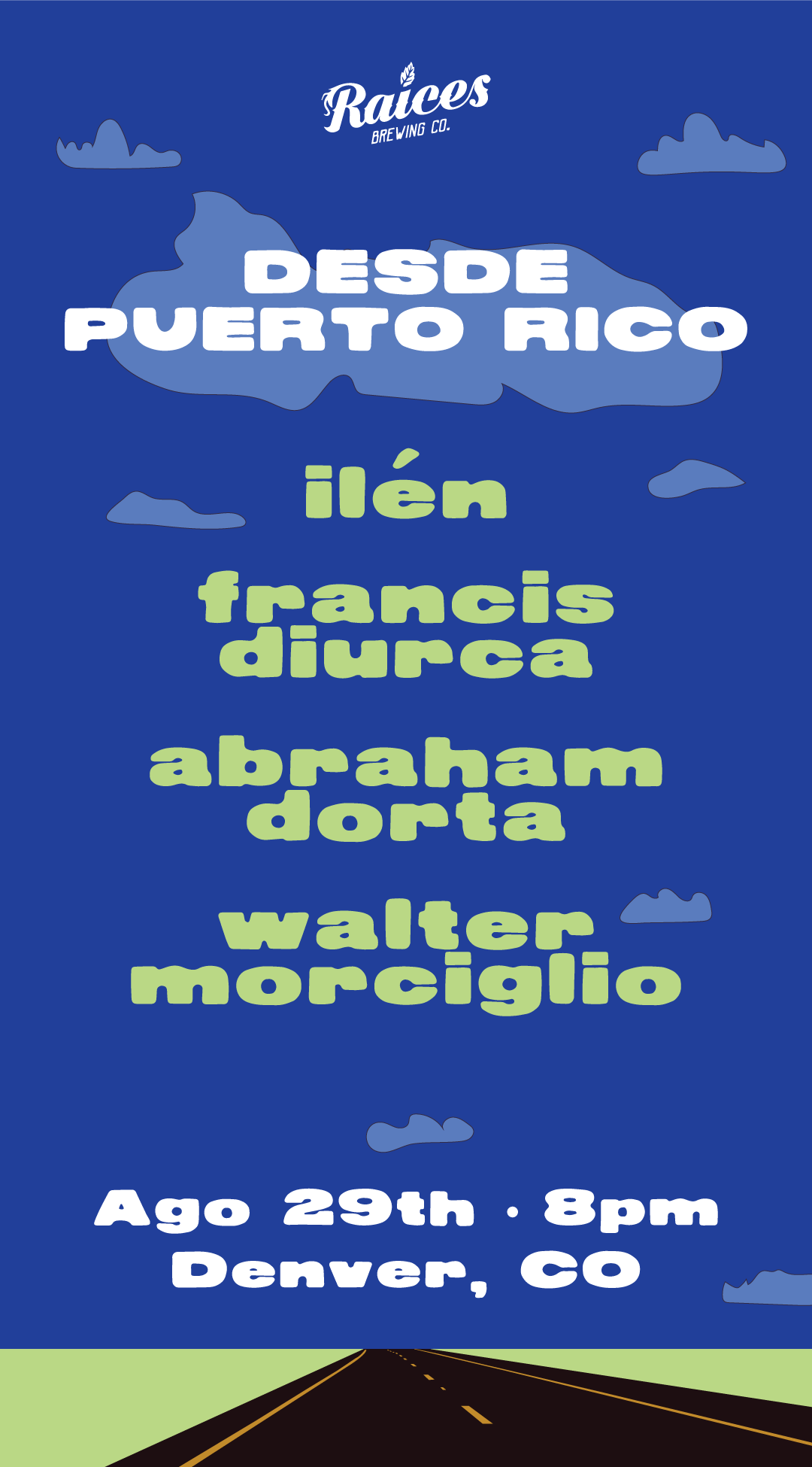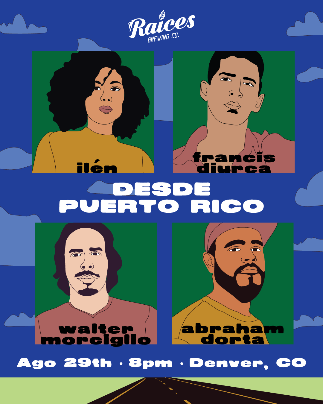 Diseño y concepto de showcase de artistas de PR para concierto en Raices Brewing en Denver, Colorado