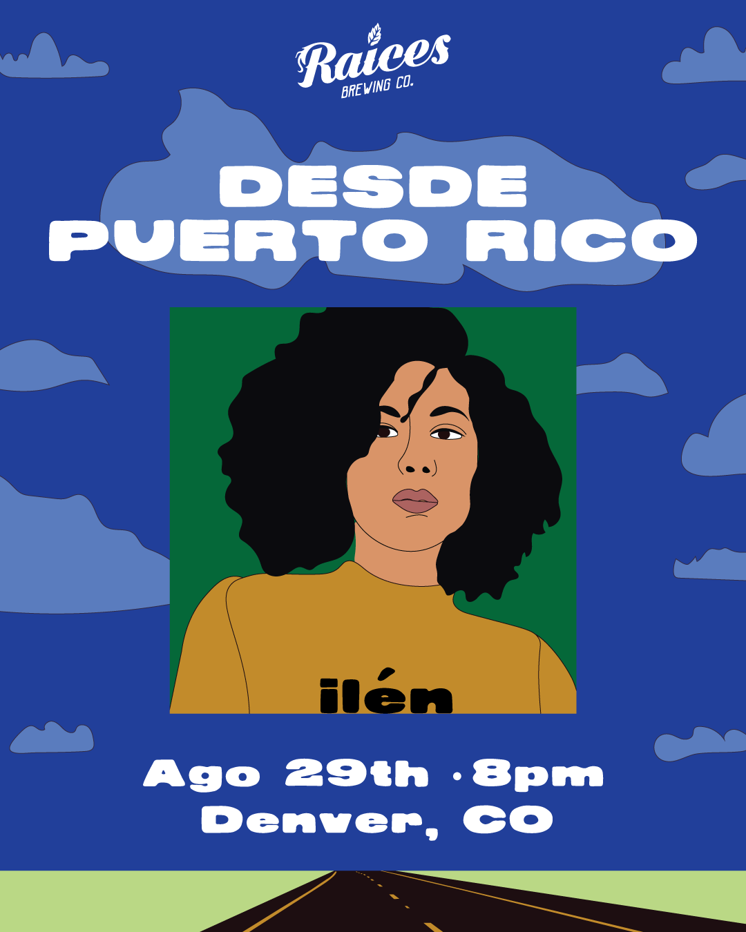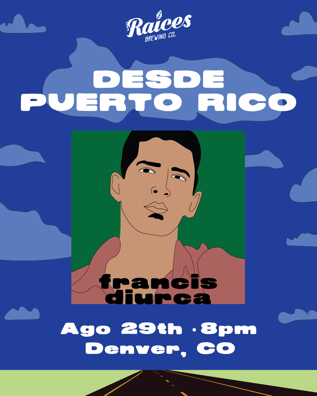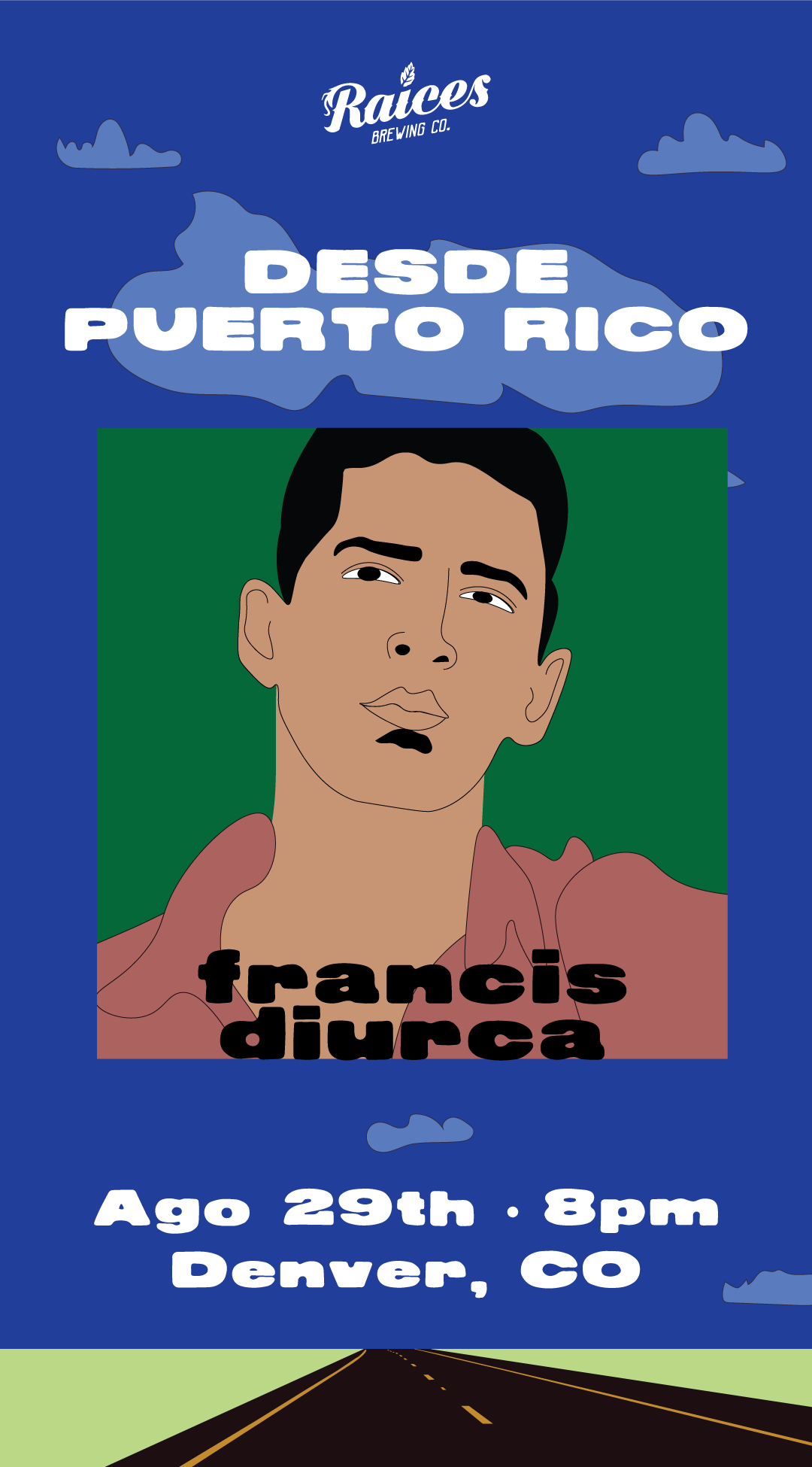 Diseño y concepto de showcase de artistas de PR para concierto en Raices Brewing en Denver, Colorado